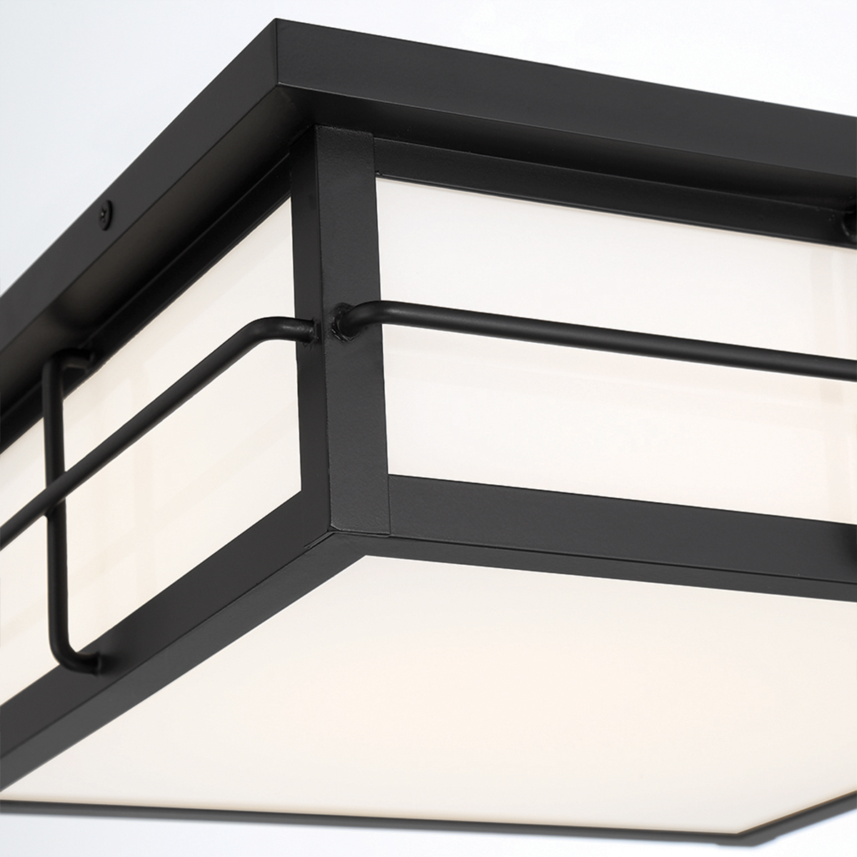 A delicate, rich black metal frame encases four opal glass panels, reminiscent of the shape of a bento box. This fixture emits a soft even glow for bright yet approachable illumination.