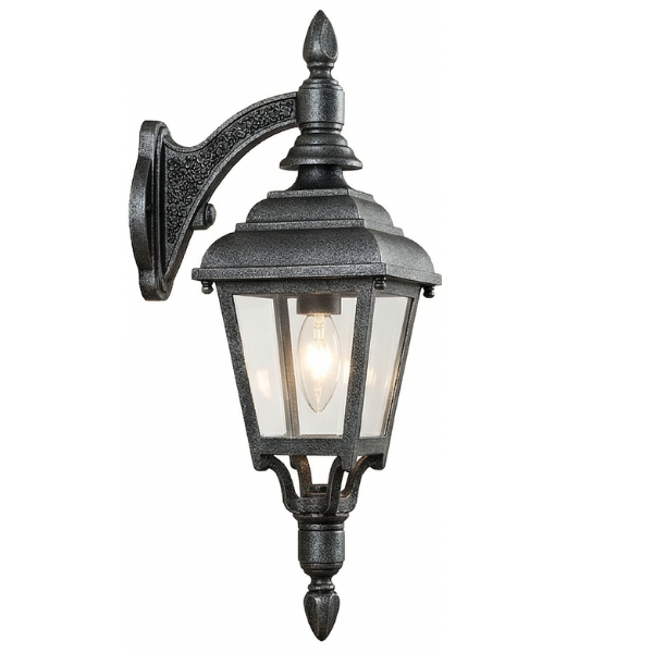 The Hanover Lantern B9943 is a handcrafted exterior wall mount featuring a "reverse standard" design, where the lantern is elegantly suspended from a top-mounted arm to provide focused downward illumination. Custom-built in the USA from heavy-duty aluminum, this fixture offers a sophisticated, hanging silhouette that is ideal for lighting up entryways, porches, and side doors with a timeless touch.