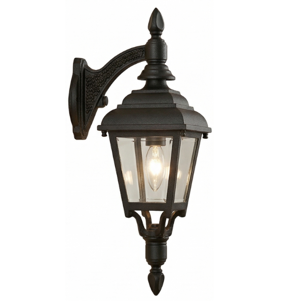The Hanover Lantern B9943 is a handcrafted exterior wall mount featuring a "reverse standard" design, where the lantern is elegantly suspended from a top-mounted arm to provide focused downward illumination. Custom-built in the USA from heavy-duty aluminum, this fixture offers a sophisticated, hanging silhouette that is ideal for lighting up entryways, porches, and side doors with a timeless touch.