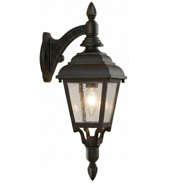 The Hanover Lantern B9943 is a handcrafted exterior wall mount featuring a "reverse standard" design, where the lantern is elegantly suspended from a top-mounted arm to provide focused downward illumination. Custom-built in the USA from heavy-duty aluminum, this fixture offers a sophisticated, hanging silhouette that is ideal for lighting up entryways, porches, and side doors with a timeless touch.