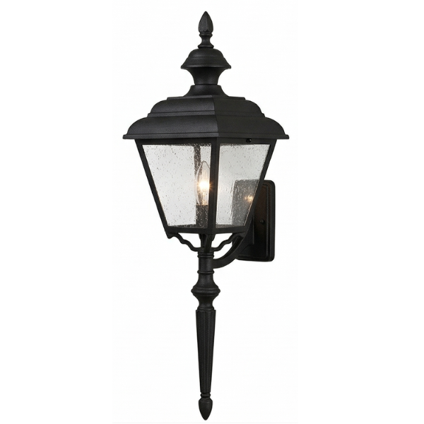 Home Decorative Exterior 24" Plymouth 4-Sided Wall Mount w/ Tail, E26, Clear Seeded Acrylic/Black Finish by Hanover Lantern