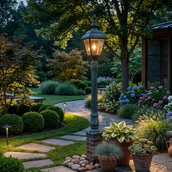 The Hanover Lantern B9955 is a large-sized, traditional exterior post-top lantern from the Value Line collection, designed to provide a stately and welcoming presence to any outdoor landscape. Handcrafted in the USA from durable cast aluminum, this fixture features a classic four-sided silhouette that offers balanced, 360-degree illumination for walkways, driveways, and entry points.