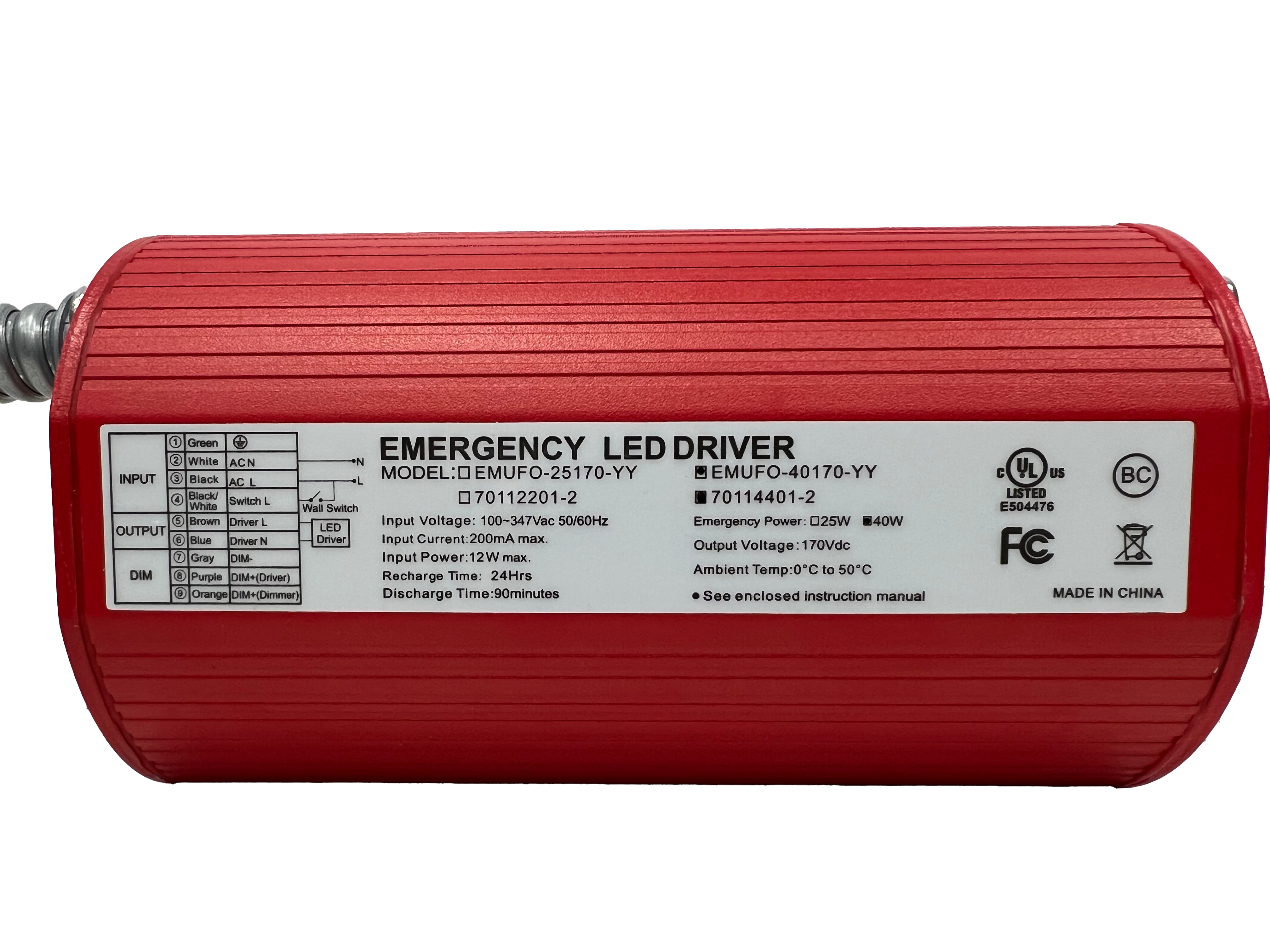 ETi Lighting’s 40W Li-ion Emergency Power LED driver for certain Linear High Bay, and Round High Bay models.
