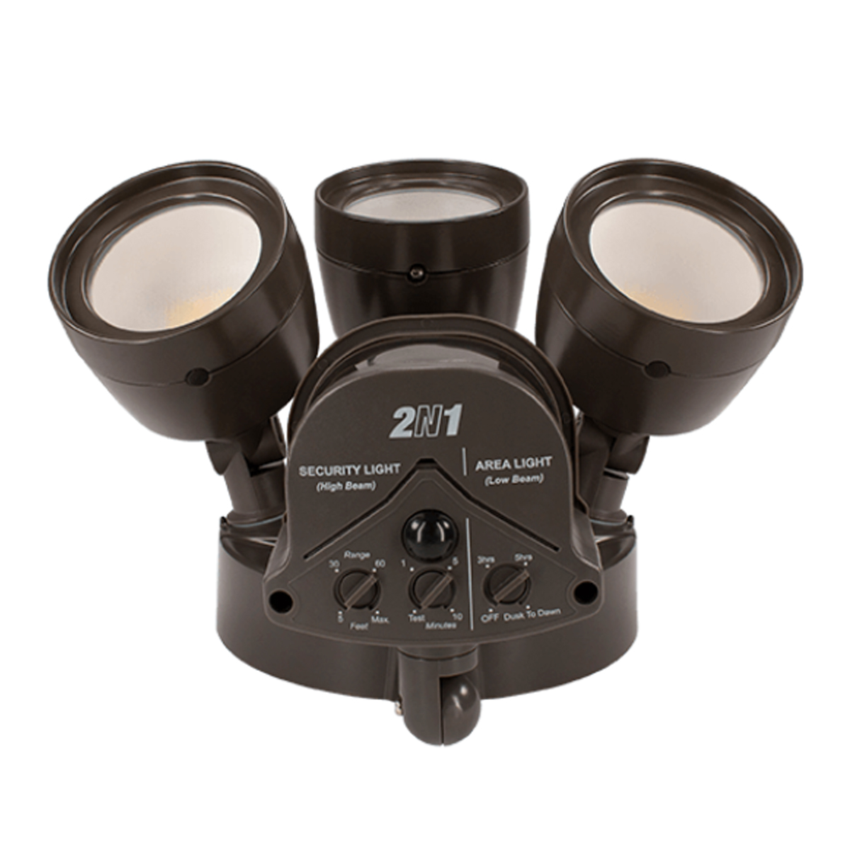 ETi SSL’s 3-Head LED Security Light has a lumen boost function which can be used to increase lighting coverage from 1800 nominal lumens to 3600 nominal lumens (4051lm based on IES test data) for broad and fuller light intensity. The light showcases a motion sensor with 240° coverage and timer or dusk-to-dawn function that will ensure safety and awareness. The dusk-to-dawn photocell enables you to control the lights from sunset to sunrise. The 3-Head Security LED Light emits 38.7-watts of energy-efficient and cool emissions of premium LED technology conserving electricity, the environment, and your wallet.