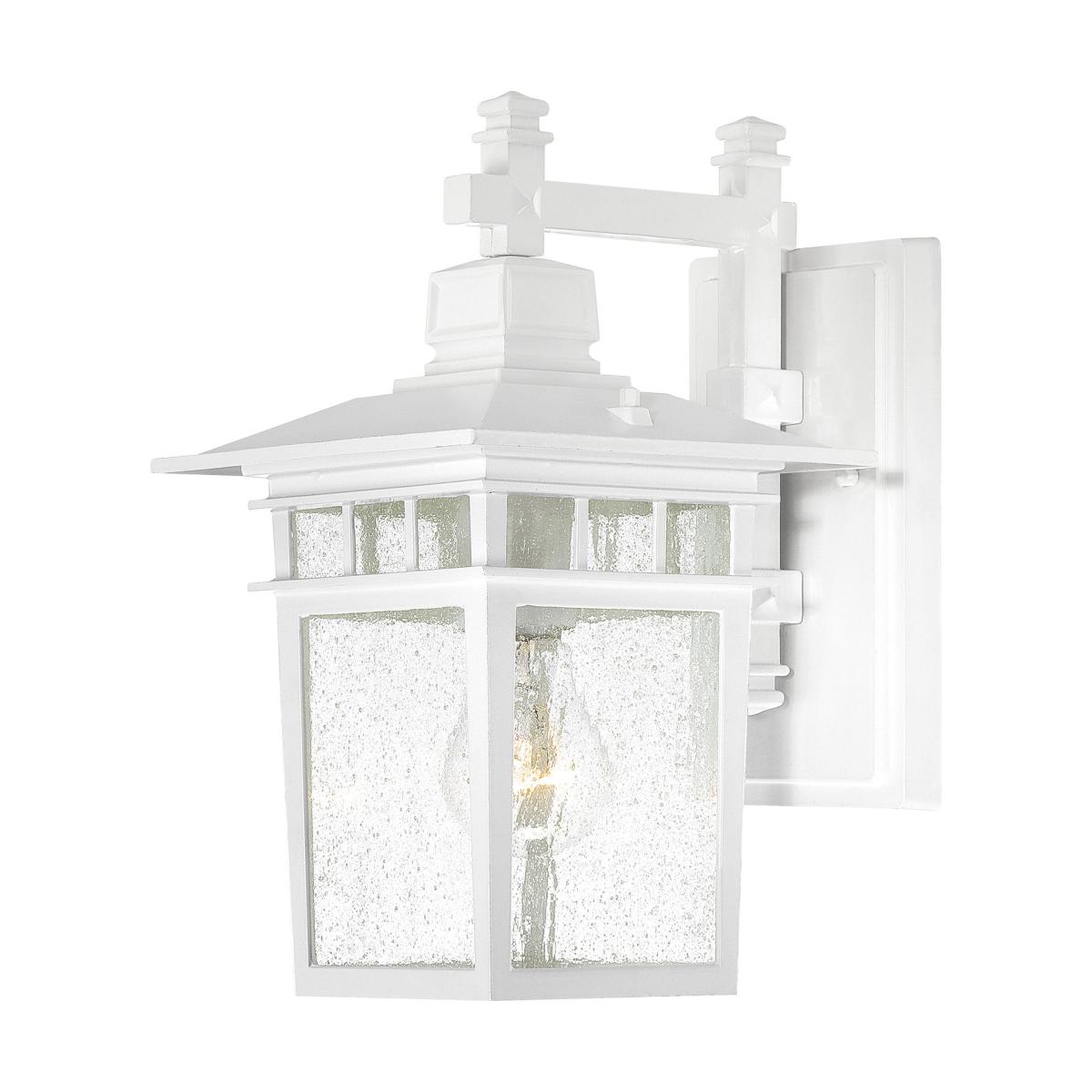 1-light, 12" outdoor wall lanternClear seeded glass for a unique textured effectWhite finish with die-cast aluminum and glass constructionWet-location rated for reliable outdoor useCompatible with 100W bulb (not included)Measures 11.75" height, 7" width, and extends 9.5" from the wallTransitional style enhances a variety of outdoor settingsIncludes a 1-year limited warranty