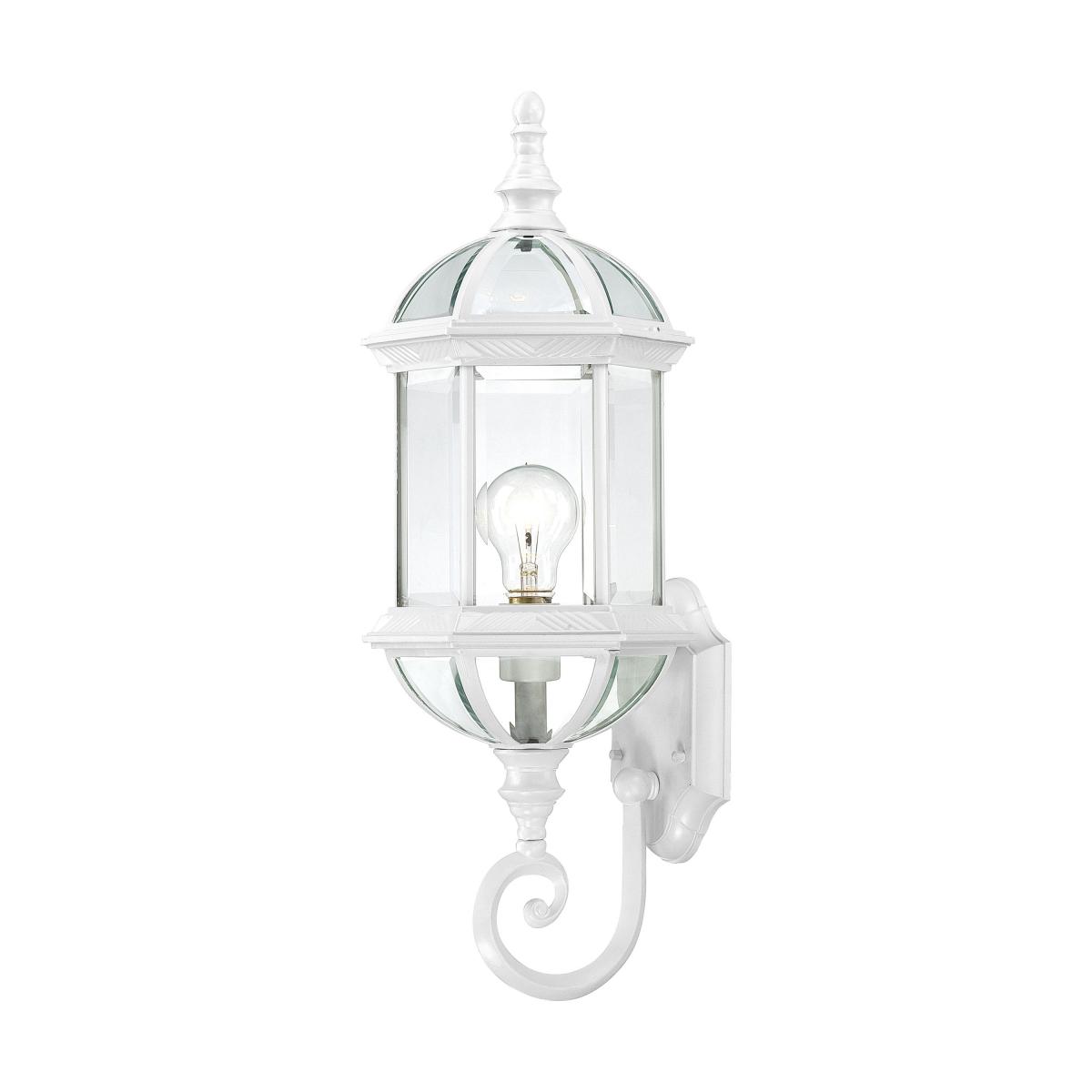 1-light, 22" outdoor wall lanternClear beveled glass for crisp lightingWhite finish with durable die-cast aluminum and glass constructionWet-location rated for outdoor useMax 100W bulb (not included)Measures 22" height, 8" width, and extends 7.88" from the wallTraditional style, perfect for outdoor spacesIncludes a 1-year limited warranty