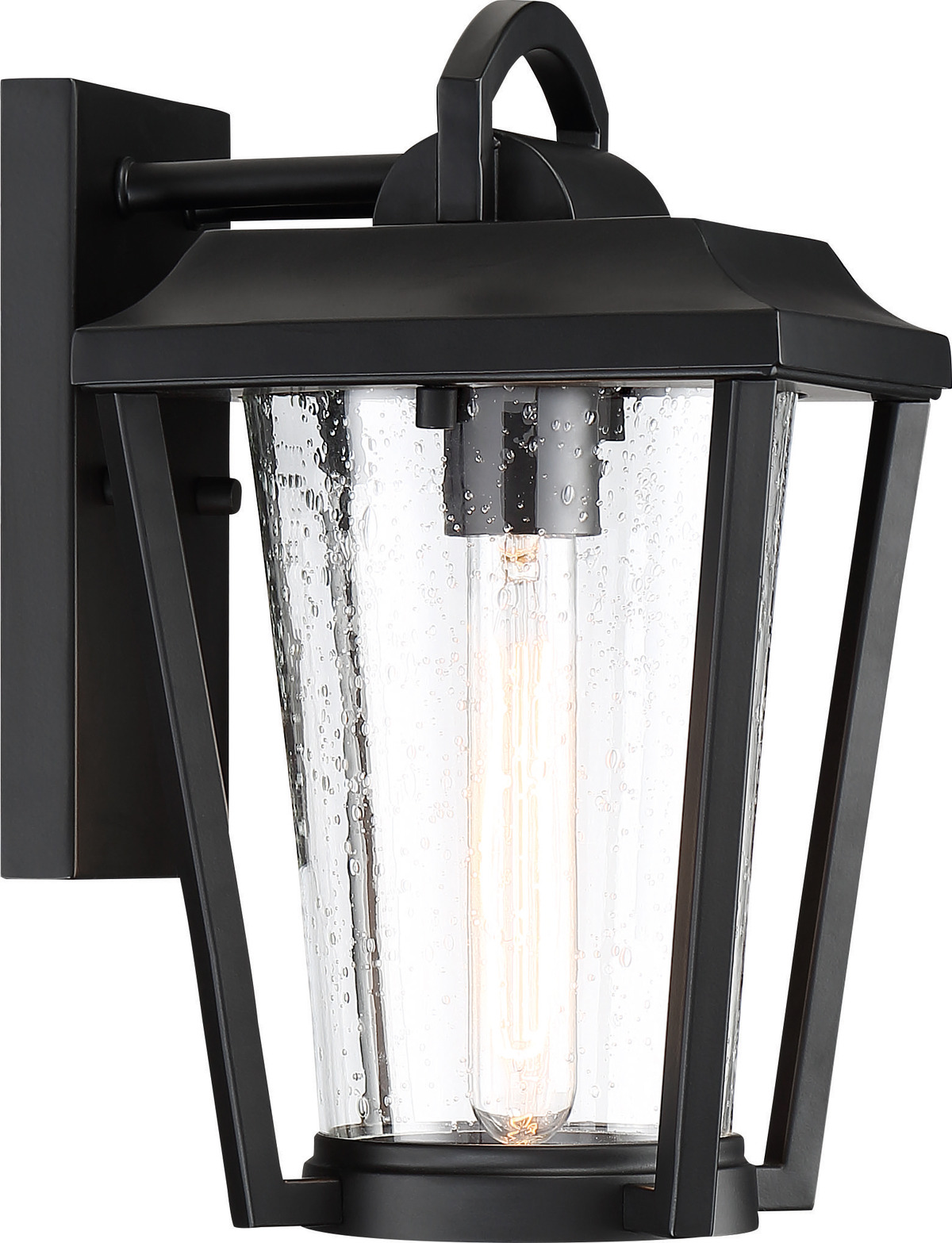 Part of the Lakeview collection1-light small outdoor wall lantern with aged bronze finishClear seeded glass for a textured light effectDurable steel constructionWet location rated for outdoor useIncludes 1 x 60W incandescent bulbDimmable with compatible bulbs and dimmersDimensions: 12.25" height, 7" width, 8.25" extensioncETLus safety listed and RoHS compliant1-year limited warranty