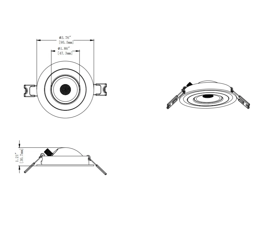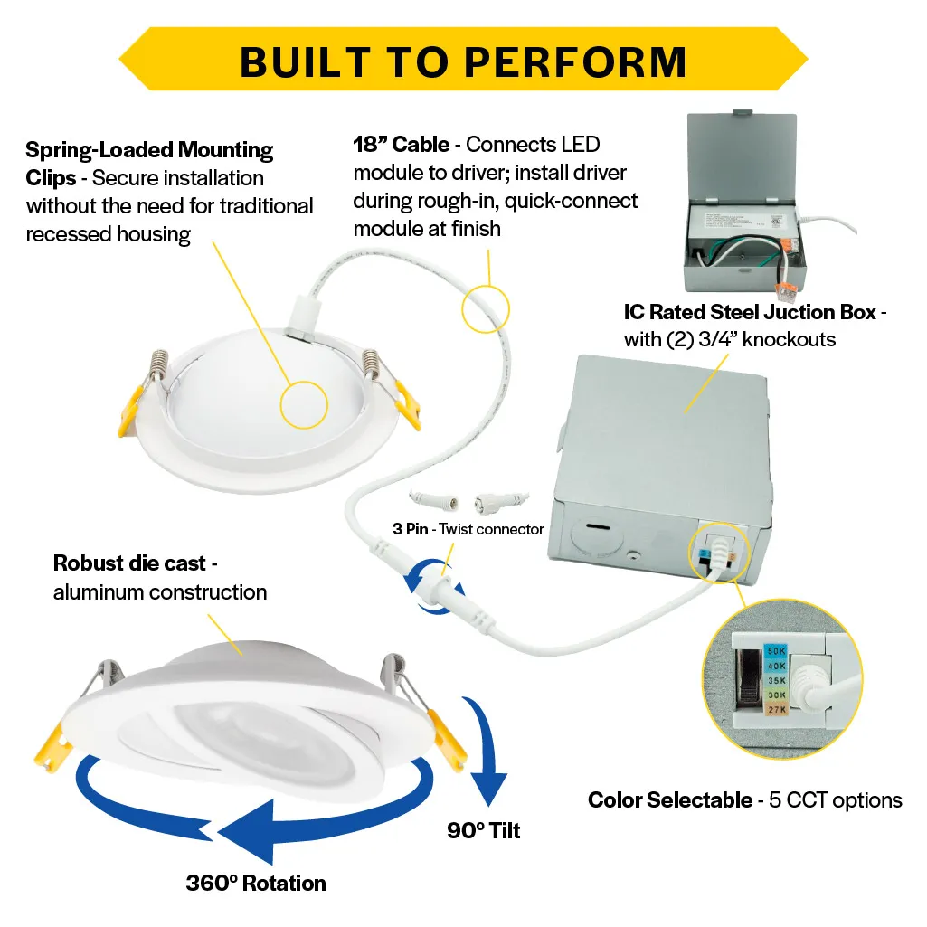 The ProLED Select Direct Fit Gimbal Downlight Series is a new twist on wall wash and accent lighting. The dome shaped light eliminates the ceiling gap associated with other adjustable light fixtures while still rotating 360° and tilting up to 90°. It installs directly into the ceiling with no need for a can or housing. The ultra-slim design is perfect for shallow plenum spaces in both new construction and retrofit downlighting applications.