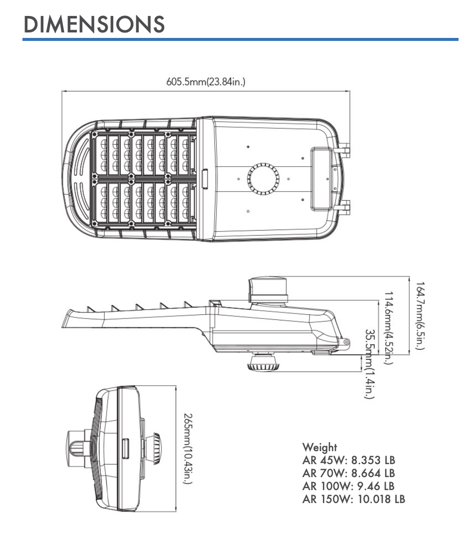 Housing: One-piece die-cast aluminum housing for optimal thermal management with conductive and convective cooling. The driver is directly assembled on the casting for low operating temperature and long server life. The removable door is 3G vibration rated that follows roadway and area lighting standards set by ANSI C136.31. This fixture is UL listed for wet locations.