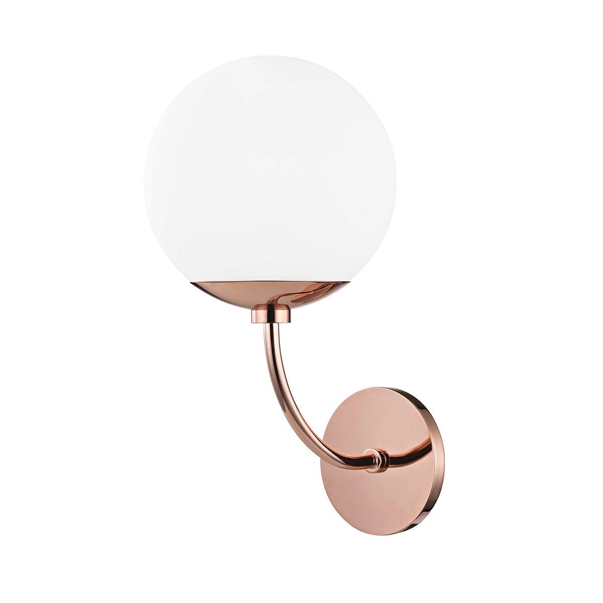 The Carrie Wall Sconce by Mitzi features a striking polished copper frame with a softly curved opal glass shade. Its minimalist design and gentle, diffused light make it a sophisticated choice for adding both warmth and modern elegance to any space. The sconce's smooth contours and subtle finish contribute to its refined, contemporary appeal.