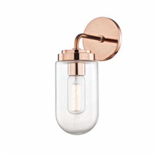 An incandescent bulb is on display inside a glass jar shade in this chic piece. Metal accents at the bulb base, arm, canopy and backplate add a touch of shine. Bath and vanity fixtures feature a beehive-inspired, ribbed glass shade.