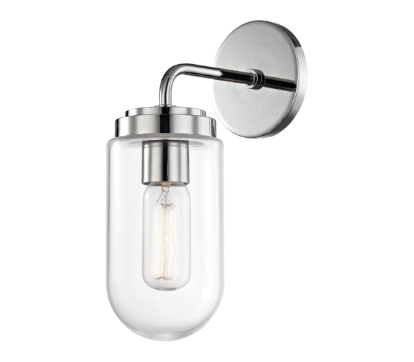 An incandescent bulb is on display inside a glass jar shade in this chic piece. Metal accents at the bulb base, arm, canopy and backplate add a touch of shine. Bath and vanity fixtures feature a beehive-inspired, ribbed glass shade.