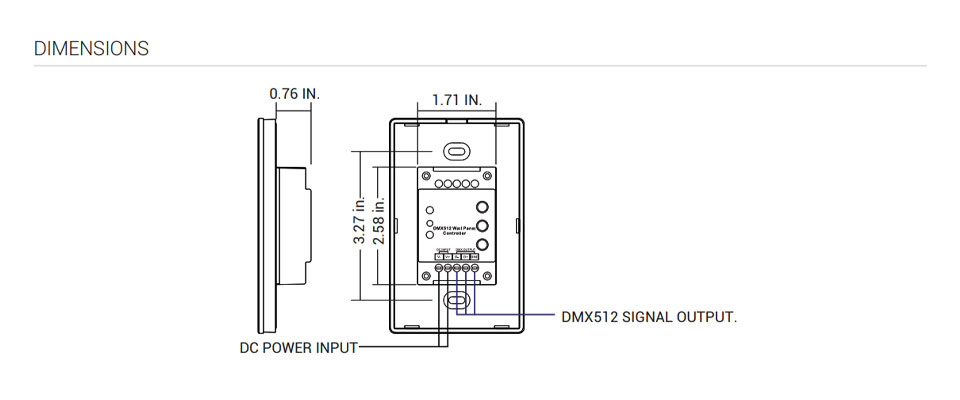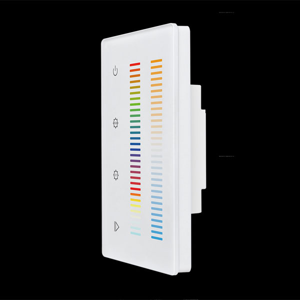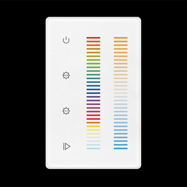 The DMX Touch Wall Controller RGBTW 12V or 24V DC is used to control the color mode, speed, and brightness of both Radialux® RGB and RGBW tape lights. Featuring a touch-sensitive glass interface, this controller can also be used to adjust the tuning range of our tunable tape lights and is compatible with DMX decoders for hard-wired DMX color control. This controller is powered by our Non-Dimmable Drivers.