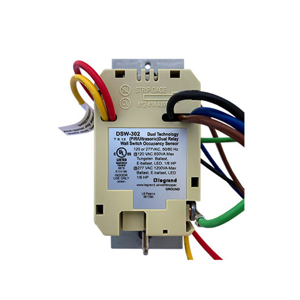 The DSW-302 dual technology wall switch sensor turns lights ON and OFF based on occupancy and contains two relays for controlling two independent lighting loads or circuits. It combines the benefits of passive infrared (PIR) and ultrasonic detection technologies for high sensitivity to small and large movements. The DSW-302 replaces existing wall switches and fits a standard decorator wall plate.