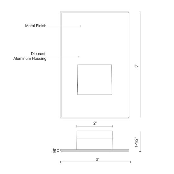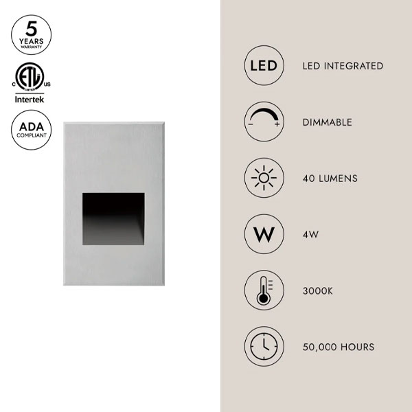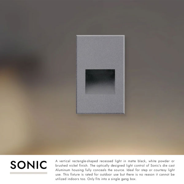 A vertical rectangle-shaped recessed light in matte black, white powder or brushed nickel finish. The optically designed light control of Sonic's die cast Aluminum housing fully conceals the source. Ideal for step or courtesy light use. This fixture is rated for outdoor use but there is no reason it cannot be utilized indoors too. Only fits into a single gang box.
