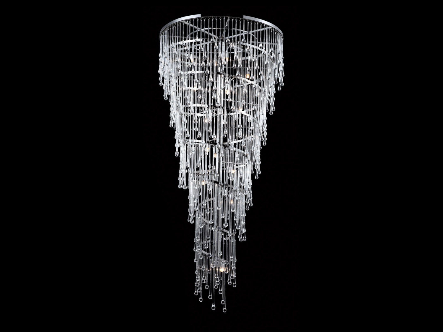 - Features dramatic cascading strands of clear glass teardrops that create a shimmering, water-fall effect adding texture and movement to the fixture