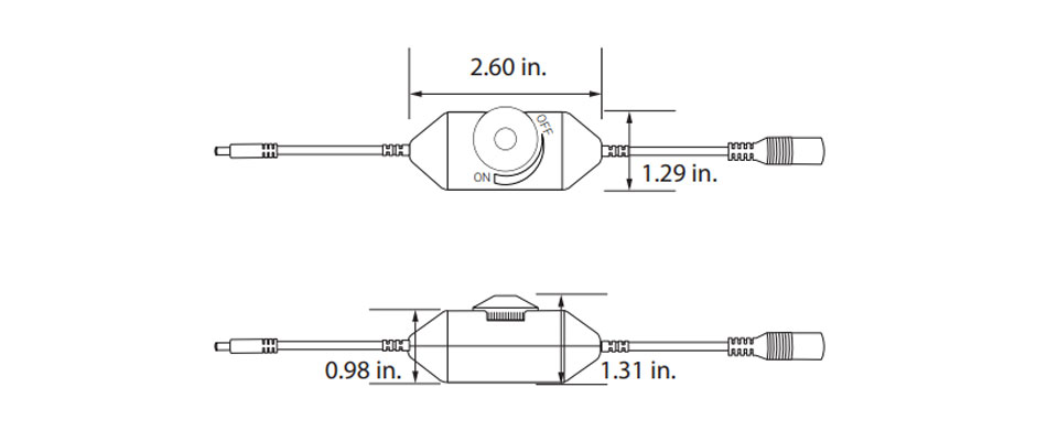 The Inline Rotary LED Dimmer Switch provides simple dimming and on/off control for LED lights. Featuring male and female DC plugs, this LED dimmer plugs directly into Alloy’s non-dimmable plug-in adapters and DC accessories, and connects directly to the Polara LED Pucks and Disc Lights. This easy-to-use accessory is compact and great for temporary and low-impact installations.