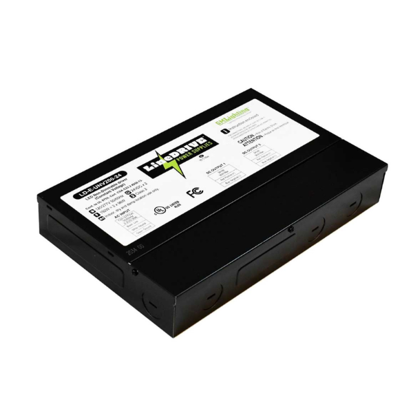 LineDRIVE Series 12VDC / 24VDC Electronic LED Power Supplies with low voltage outputs are designed to work with standard ELV/Incandescent TRIAC (leading edge) dimmer switch. Encased in a low-profile lightweight aluminum enclosure that includes multiple knock-outs to enable easy installation.