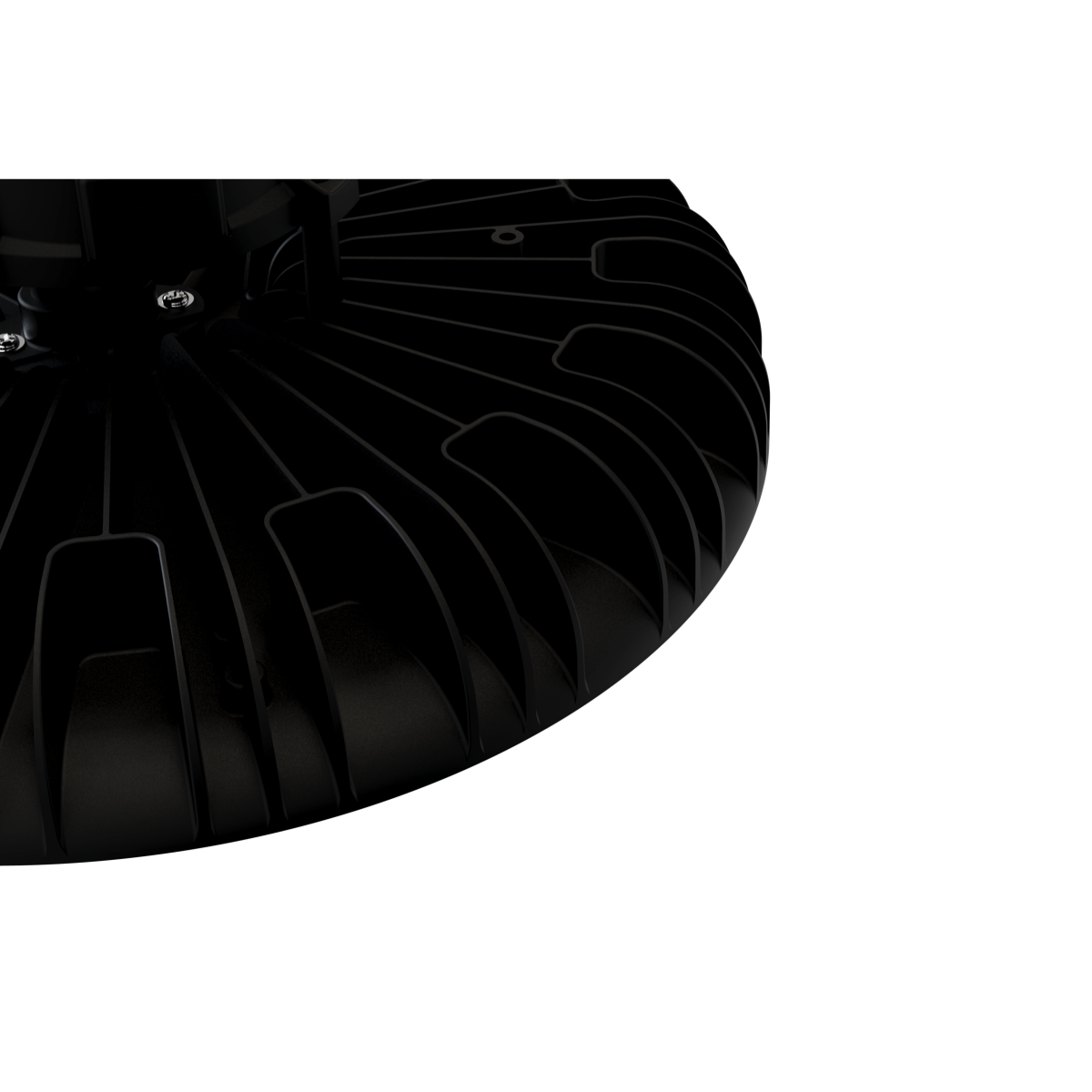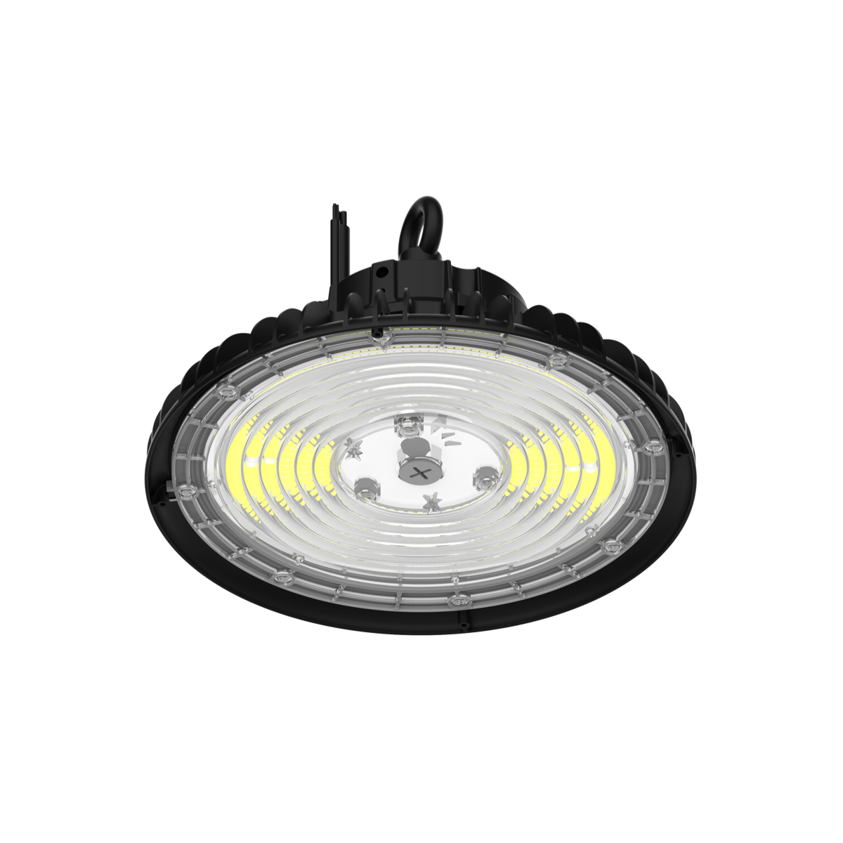 DESIGN. LED UFO HIGH BAY is extremely efficient with a 150lm/W output. Die-cast aluminum housing with excellent heat dissipation along with an antiglare PC lens provide many years of use. It can operate in temperatures ranging from -40 to 140°F. It is designed to operate on 120-277V circuits with a 0-10V dimmable driver.