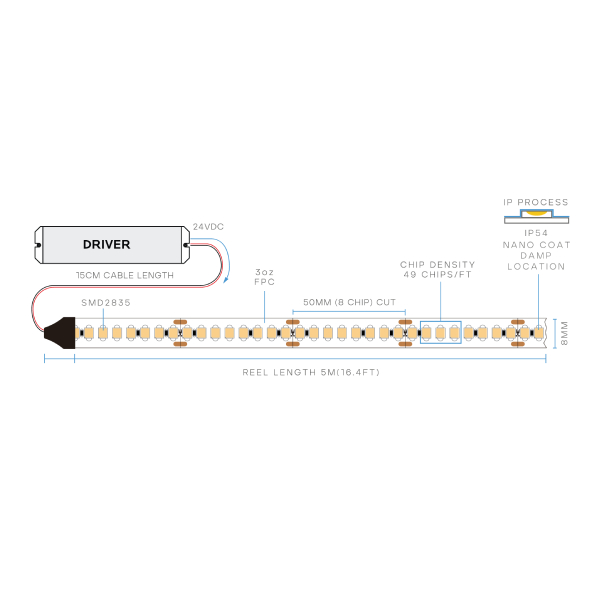 The Luxrite LR44404 is a 24V SMD LED tape light designed for crisp 6500K illumination with exceptional 90+ CRI color rendering and IP54 damp-location rating for architectural, residential, and retail accent applications. Featuring 2835 LED chips at 160 LEDs per meter within a 10mm width and 50mm cut increments, its 16.4 ft rolls deliver bright 6W per foot output (19.2W total) ideal for coves, under-cabinetry, and display lighting with 3M adhesive backing, UL certification, and LifeRite warranty.
