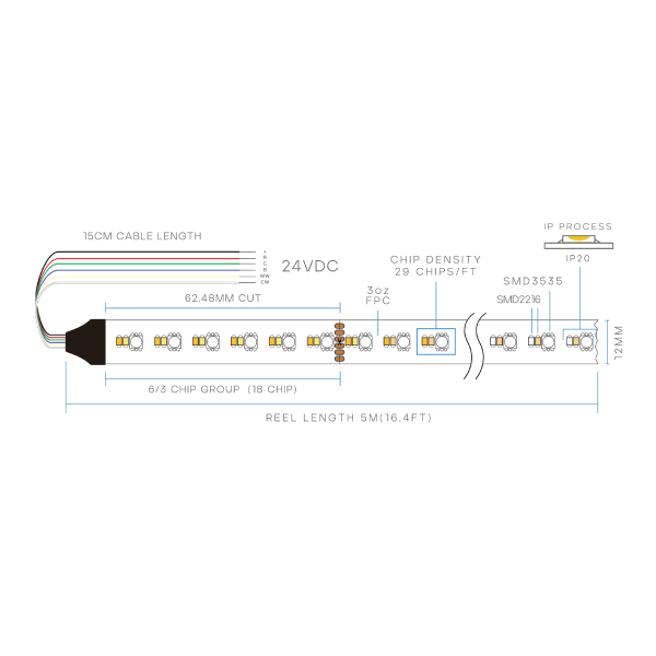 The Luxrite LR44900 is a versatile 24V SMD LED tape light featuring RGBWW technology with 90 CRI for dynamic color changing and tunable white (2700K-6500K) illumination in IP20 dry-location architectural, residential, and retail applications. With high-density 3535 LED chips, 120° beam angle, 62.48mm cut increments, and 7W per foot output over 16.4 ft rolls, it delivers seamless RGB+WW effects ideal for coves, under-cabinetry, and mood/display lighting with 3M adhesive backing, UL certification, and LifeRite warranty.