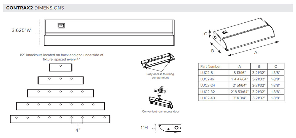 The economical Contrax2 provides the necessary illuminance for all undercabinet task lighting. With contractor-friendly knock-outs and a versatile access panel, hard-wiring each fixture is simple and straight-forward. Available in 3000K, two finishes and five different linear lengths, the Contrax2 will provide the essential task lighting in application.