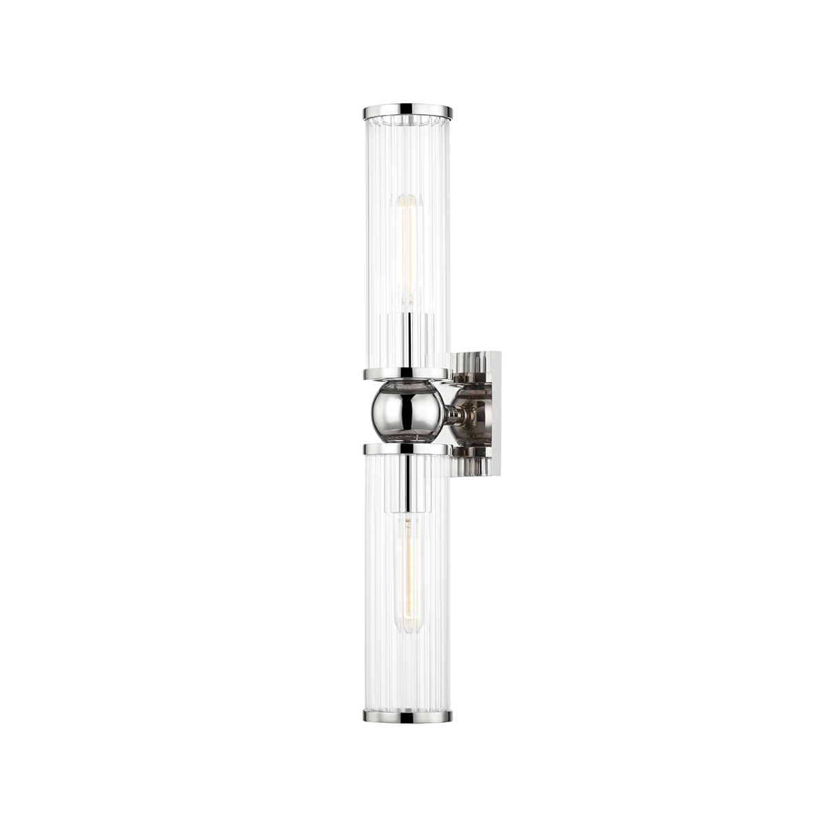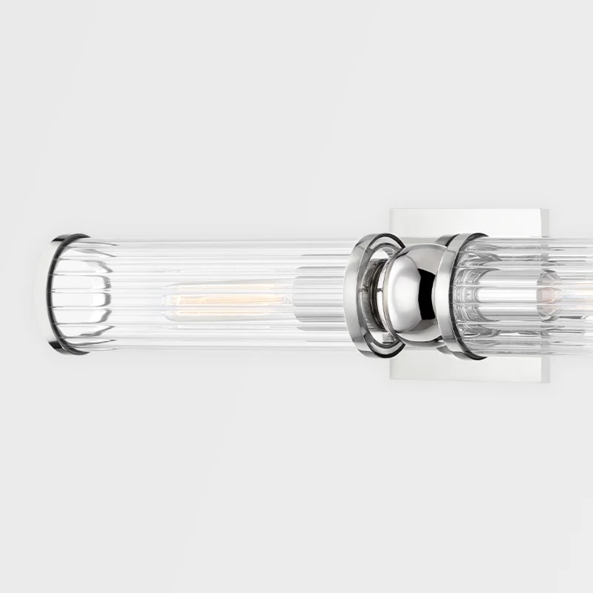 The Malone Wall Sconce is classic mid-century modern with an updated look. The fluted glass shades create a sparkling illumination, and the fresh metal finish accents a variety of spaces. Available in Aged Brass or Polished Nickel.