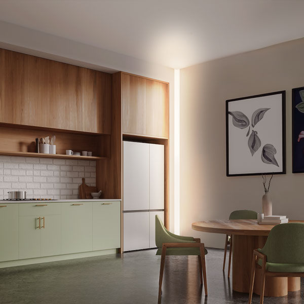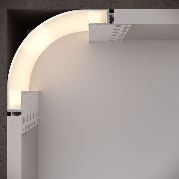 Mudr ArcCove 4 in. is a compact corner-mounted recessed cove channel with an illuminated reveal. It features soft indirect light designed to illuminate corners at wall-to-wall and wall-to-ceiling intersections and is compatible with 5/8 in. drywall.