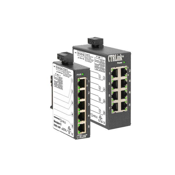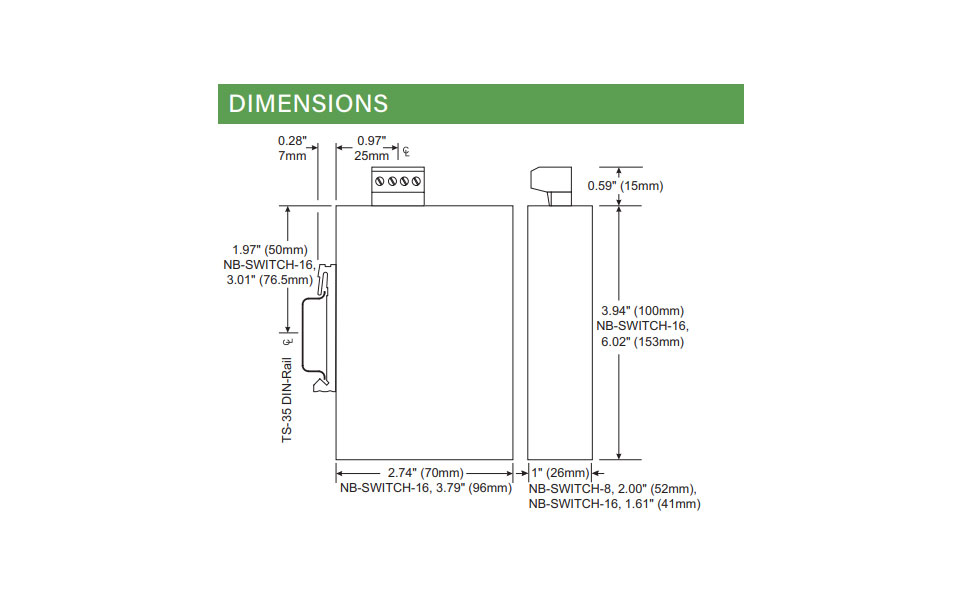The NB-SWITCHES are enterprise-grade Ethernet switches that work with up to four or seven NB-ROUTERS to provide high speed connectivity for Digital Lighting Management (DLM) networked systems. The compact switch has a rugged metal enclosure and integral DIN rail clip.