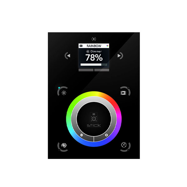 The feature rich lighting controller has been designed to provide a control solution for the most demanding of projects, whilst maintaining an easy to use panel of touch sensitive buttons. The controller integrates a graphical color screen allowing scene photos to be displayed. Easily view the selected zone, scene name and design without the need to navigate through complex menus. Change the speed, color and dimmer using the circular palette.
