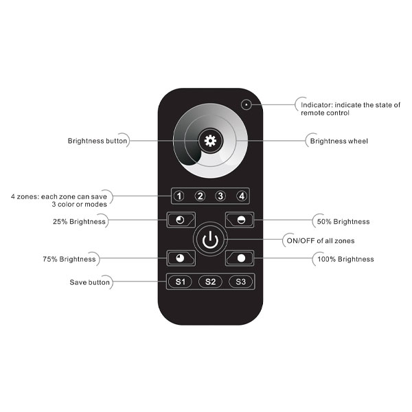 This wireless Remote Control Dimmer Switch works with the Wireless Receiver (AL-60-03-0004 – sold separately) to provide full dimming and on/off control, and includes a touch wheel that allows for direct visual selection of brightness. It can also operate up to four independent zones, so you can use additional Wireless Receivers (sold separately) to produce different brightness levels in different rooms or parts of a space. This remote can save up to three custom brightness settings.