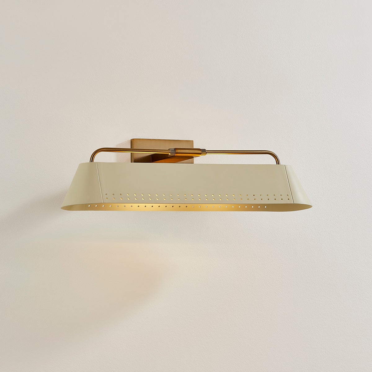 In a tapered racetrack shape, Rowan provides a sleek option for lighting a wall or picture. Small perforations along the shade enable an increased wash of light while also adding a decorative accent to the Soft Sand shade. Rowan is available in two sizes with a Patina Brass finish.