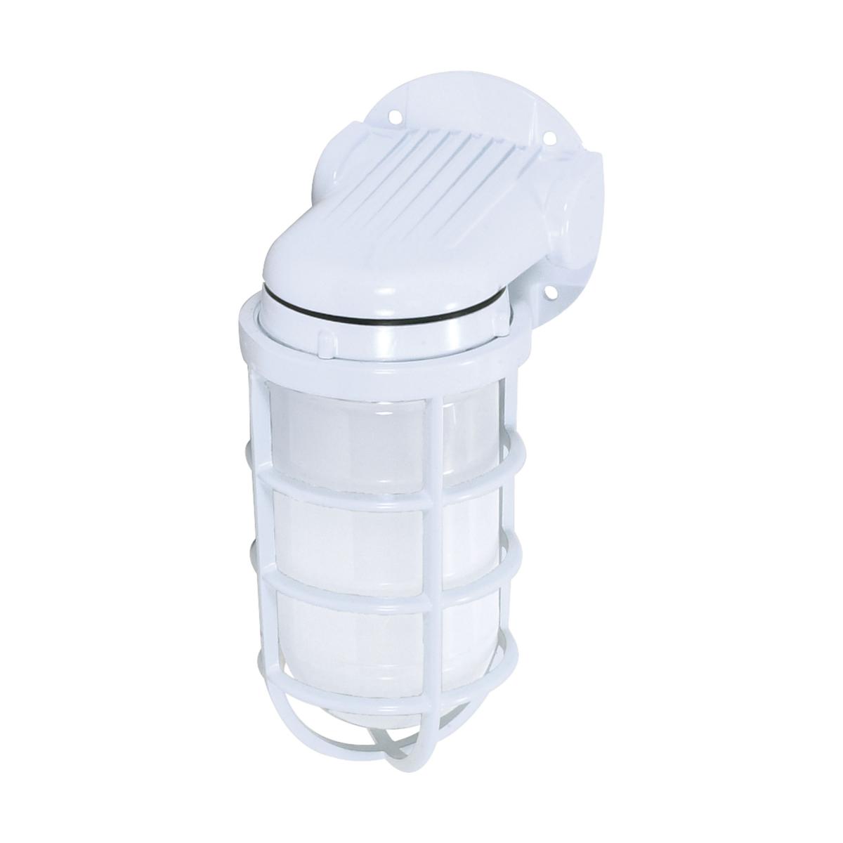 1 Light vapor-proof wall mount fixture10-inch size with a sleek white finishFeatures frosted glass for a diffused lighting effectIdeal for outdoor use with a wet location ratingDimensions: 9.38" height, 4.25" width, and 5.38" extensionCompatible with medium base bulbs up to 150W (bulb not included)Constructed from durable glass and metal materials1-year limited warranty