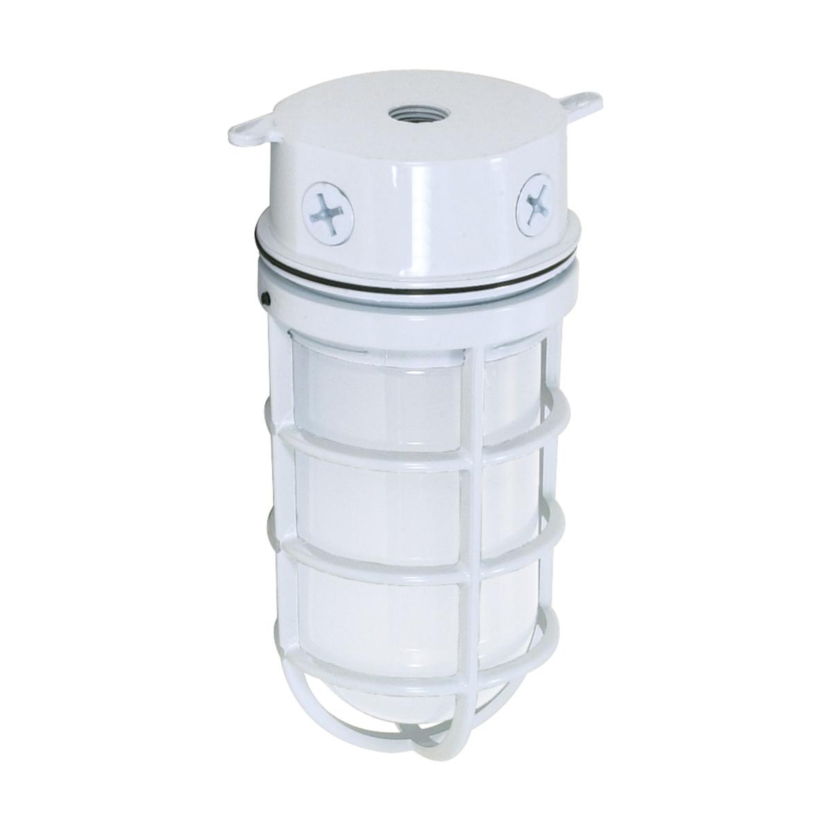 1-light vapor-proof surface mount fixtureFrosted glass diffuser for even light distributionWhite finish with a compact 9.38" heightSuitable for wet locations, ideal for outdoor useUses up to 100W medium base bulb (not included)UL listed for surface mount applicationsDurable glass and metal construction