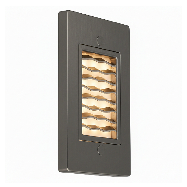 Step 1 is an energy efficient outdoor IP65 rated accent step light that fits any standard j-box in a vertical or horizontal orientation. It is offered in warm white or amber LED with brushed nickel, antique bronze, or white finish. An outer trim plate can be changed for a dual finish color design. There are 7 different face plate options including white opal face, vertical/horizontal louver, vertical/ horizontal cove, or vertical/horizontal wave. This cover is made of die-cast zinc-magnesium.