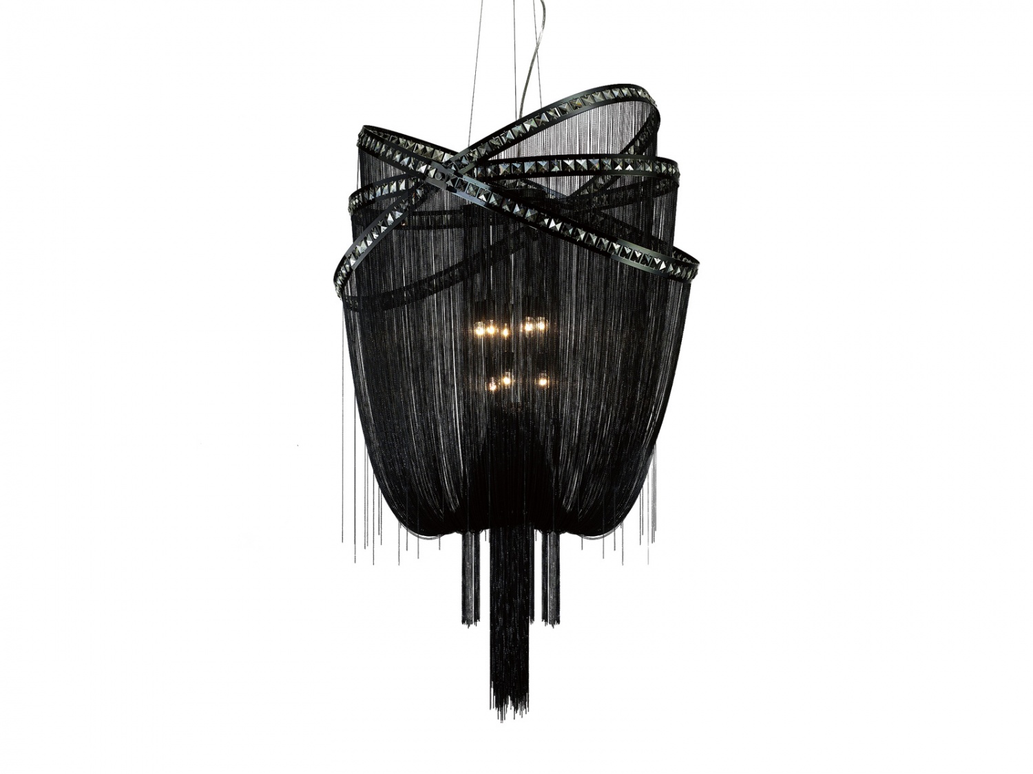 - Draped chain design features cascading strands of fine metal chains that create a shimmering, waterfall-like effect, adding texture and movement to the fixture.