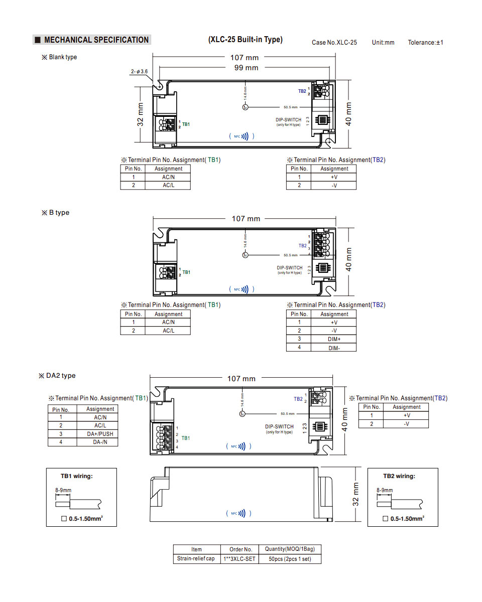 XLC-25 series is a 25W with constant power output LED driver. It can operate from 100-305V AC and output current ranging between 300mA to 1050mA selectable by DIP switch or NFC setting. Thanks to high efficiency up to 88%, it is able to operate for -25ºC~85ºC case temperature under free air convection. XLC-25 series is designed based on latest safety regulations with 3-in-1 and DALI-2 dimming. XLC-25 can also be adjusted for brightness with a push button as a simple way dimming, so it provides more flexibility for LED lighting application.