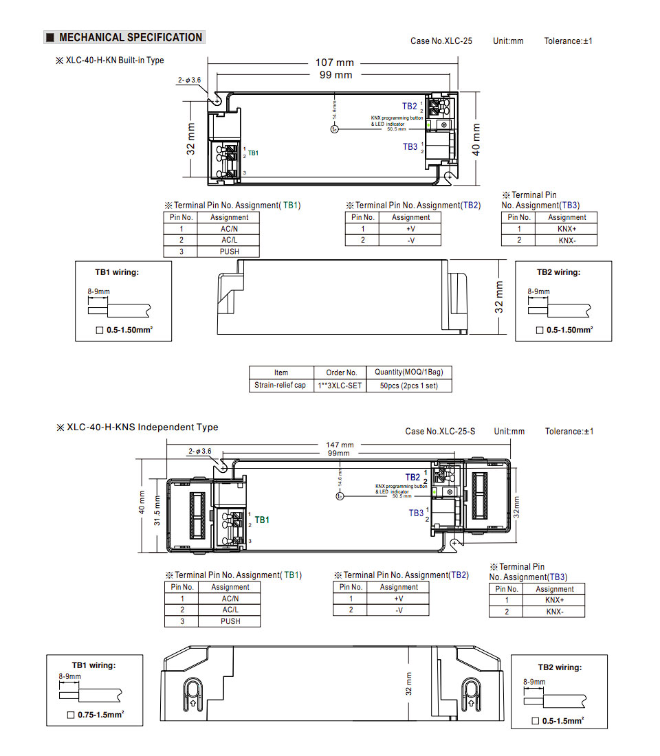 XLC-40-KN series is a 40W with constant power output LED driver. It can operate from 100-305V AC and output current ranging between 600mA to 1400mA selectable by ETS database. The integrated KNX interface avoids using the complicated KNX-DALI gateway. Thanks to high efficiency up to 88%, it is able to operate for -25ºC~90ºC case temperature under free air convection. XLC-40-KN series is designed based on latest safety regulations, and provides more flexibility for LED lighting application.