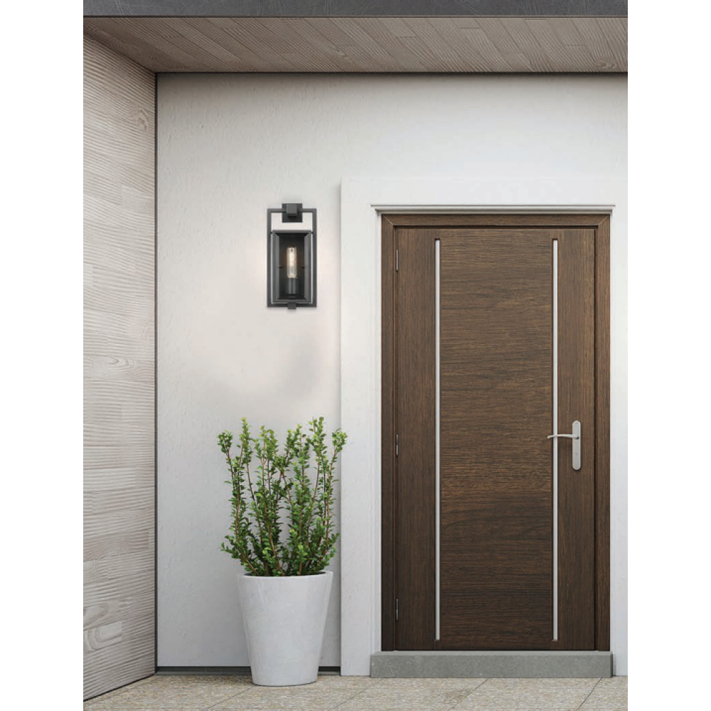 Part of the Exhibit collection1-light small wall lantern with matte black finishClear beveled glass for a modern, stylish lookConstructed from durable steel and glassWet location rated for outdoor useAccommodates up to 60W bulb (not included)Dimmable with compatible bulbs and dimmersDimensions: 14" height, 6" width, 3.75" extensioncETLus safety listed1-year limited warranty