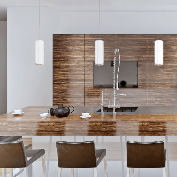Single LED cylinder shaped pendant with glass disc. Equipped with our powerful 120V AC LED technology, with metal details in white, black or brushed nickel finish. Round canopy matches the selected finish.