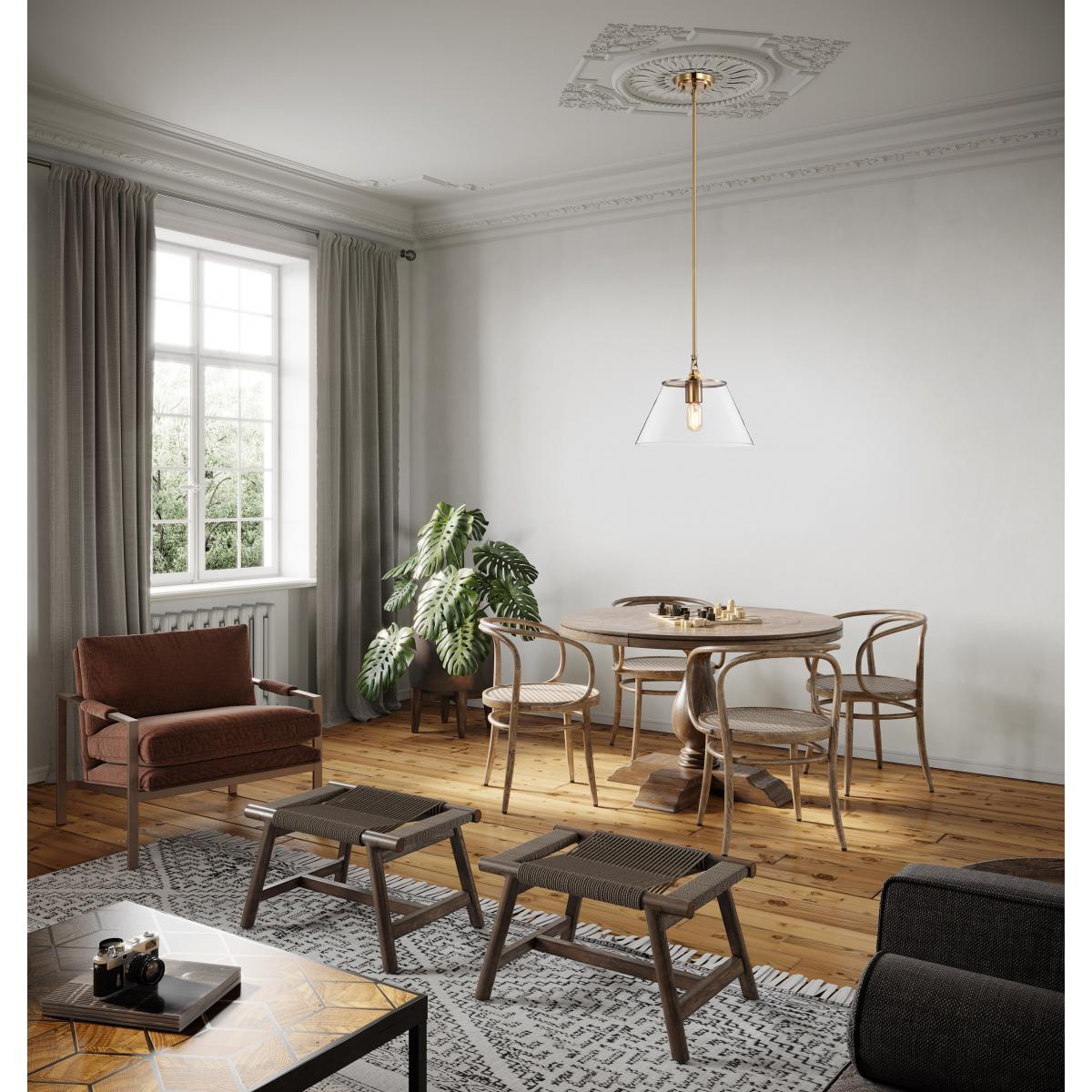 With subtle detailing, the Dover medium pendant is graceful yet unassuming. The simple clear glass shade features trim finished in vintage brass to match the fixture's body. Place a trio of them over the kitchen island for added light or over nightstands in a bedroom as a permanent lighting solution.