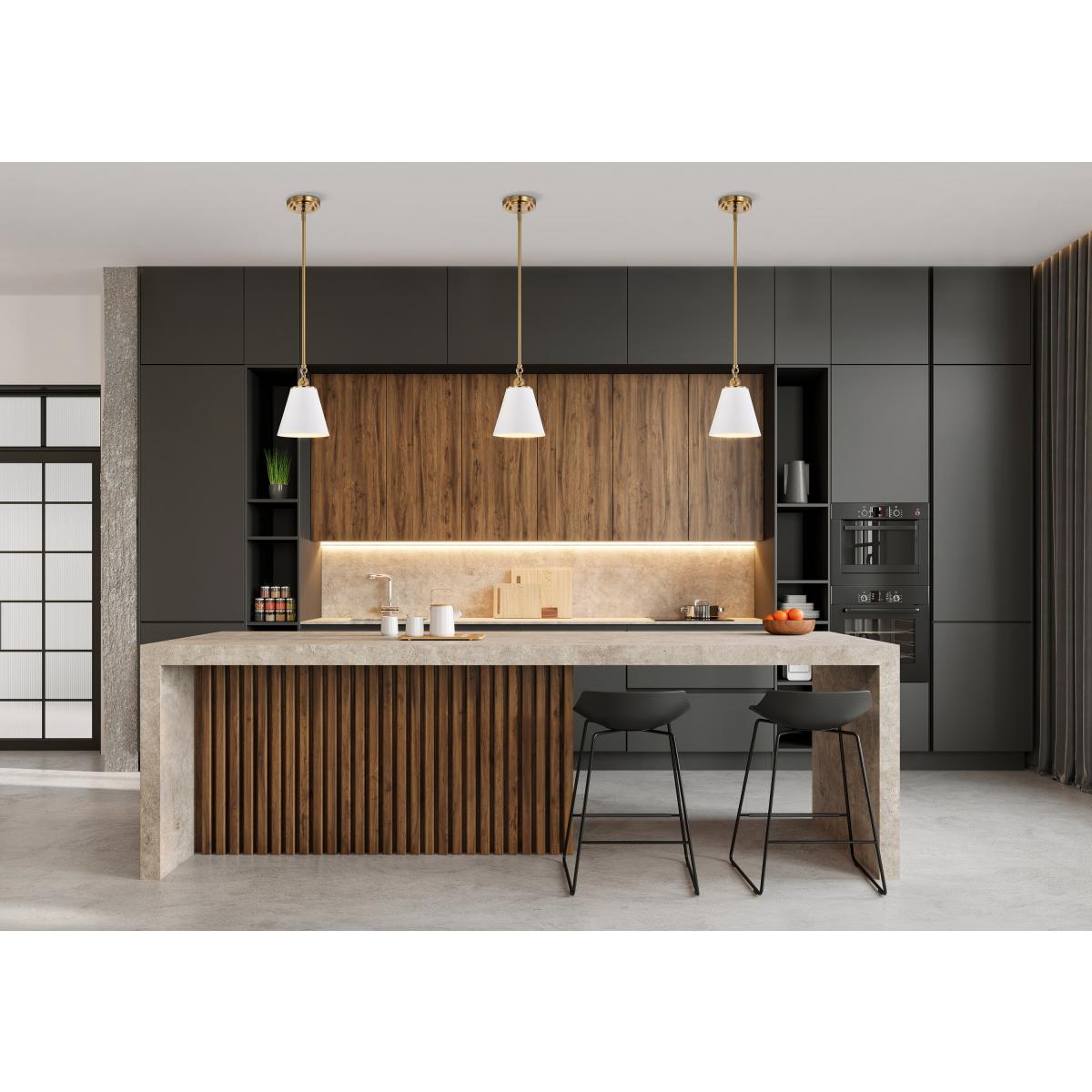 With subtle detailing, the Dover pendant is graceful yet unassuming. The simple white shade features a white lining to reflect the light, and the trim is finished in vintage brass to match the fixture's body. Place a trio of them over a kitchen island for added light or over nightstands in a bedroom as a permanent lighting solution.