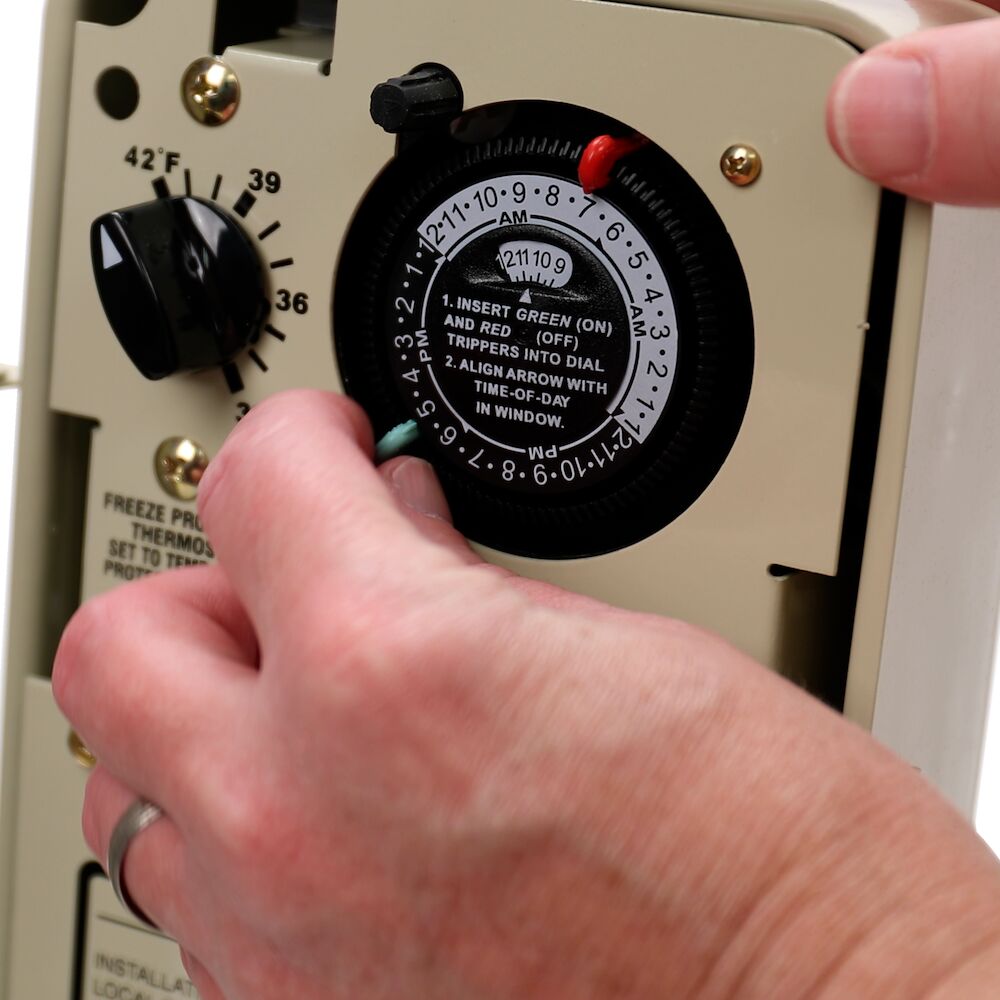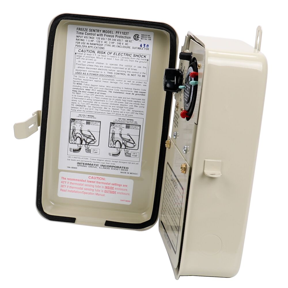 Protects pool/spa equipment against freeze damage. Turns pump and heater on when the outdoor temperature drops. Integrated adjustable thermostat.