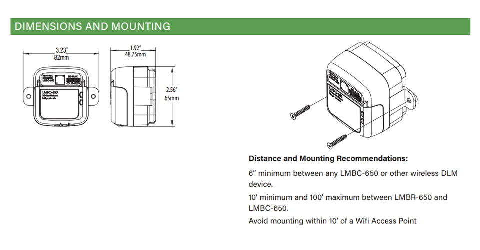 The LMBC-650 Wireless Network Bridge provides room to room network connectivity for rooms with Wattstopper Digital Lighting Management (DLM) devices. The wireless DLM platform simplifies room to room communication and installation, and eliminates potential start-up delays caused by wiring issues.