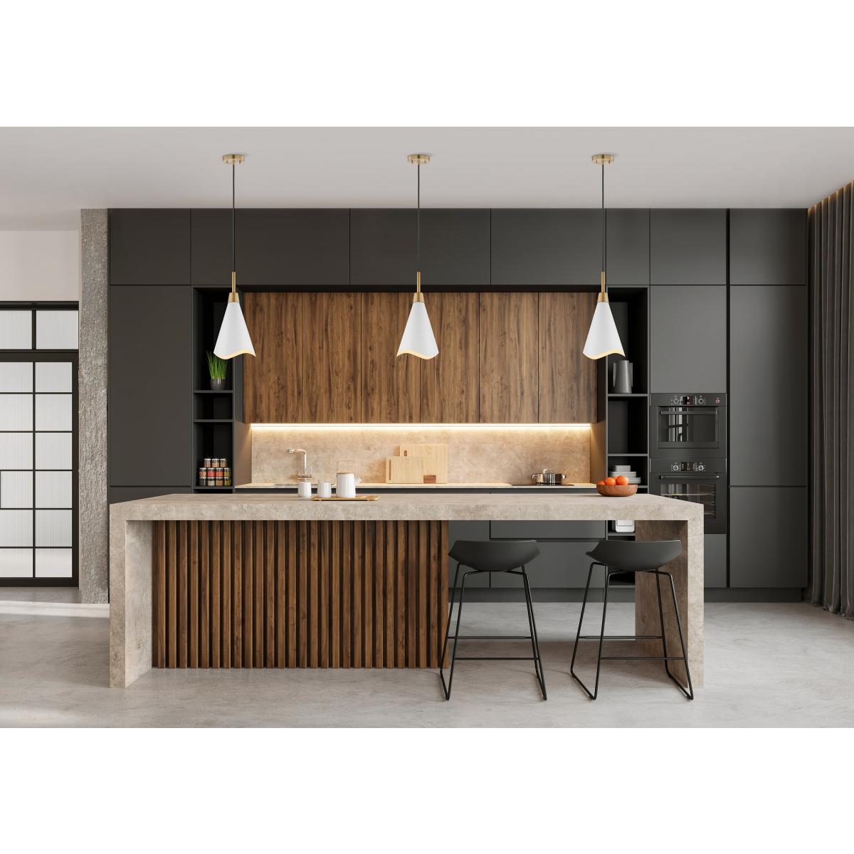 The Tango small pendant proves that simple style does not have to be boring. It features burnished brass accents on the base, cable collar and canopy, which gives the design some pop. The matte white metal shade is laser-cut on its edge in a subtle wave pattern, adding a soft touch to the style. Ideal for lighting a kitchen island, a corridor or hallway, or the dining room. With Tango, the possibilities are endless.