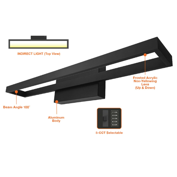 24" Modern Indirect Vanity Light, CCT Selectable, Black Finish by EnvisionLED