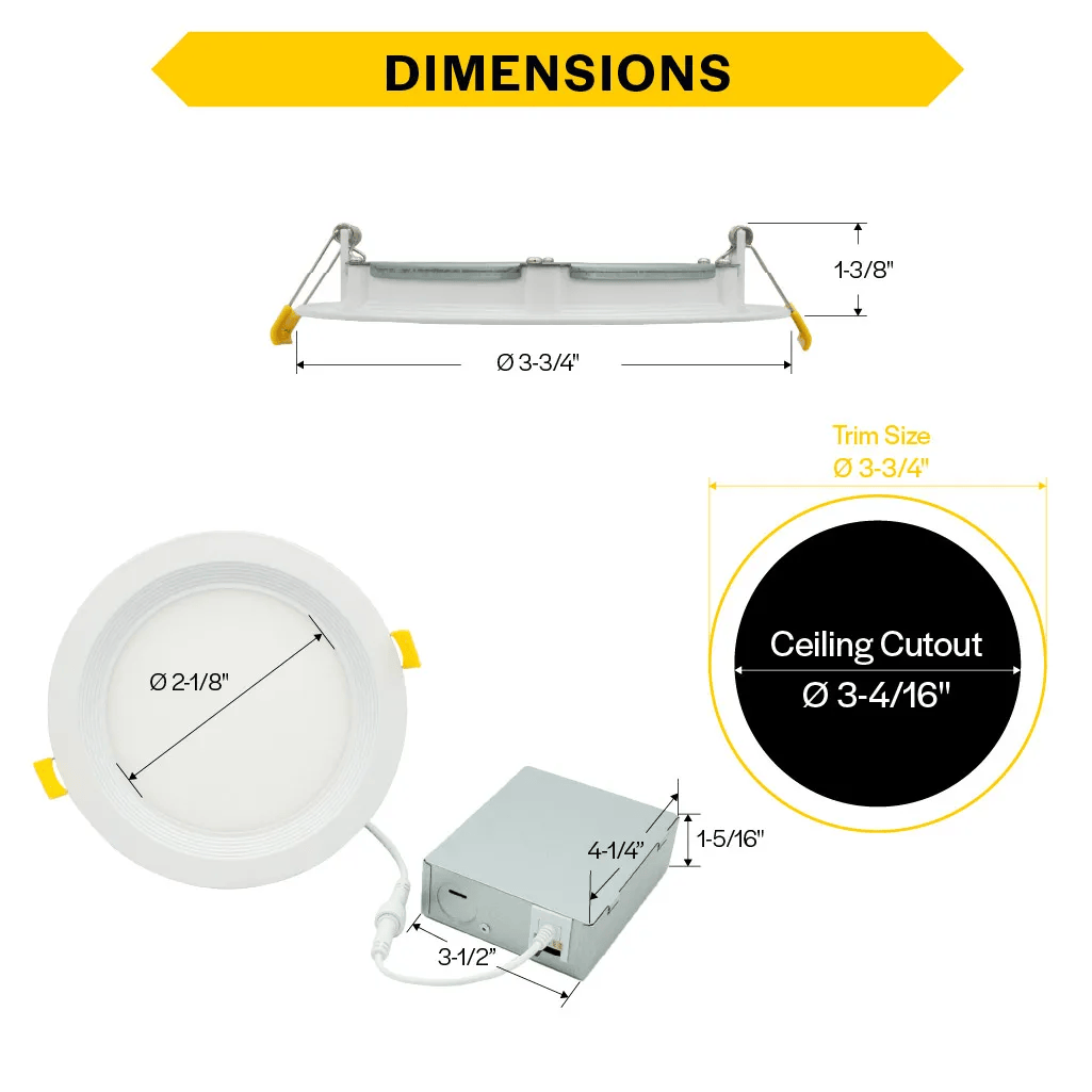 The Halco ProLED Color Selectable (CCT) Direct Fit Slim Downlight Series provides an ultra-slim solution for shallow plenum spaces in both new construction and retrofit downlighting applications. This product features five selectable color temperatures, 90+ CRI and a low glare output to provide a high performing and simple solution for any lighting project. A perfect choice for Ceiling Light, Overhead Light, Awning Lighting, and Under Eave lighting.