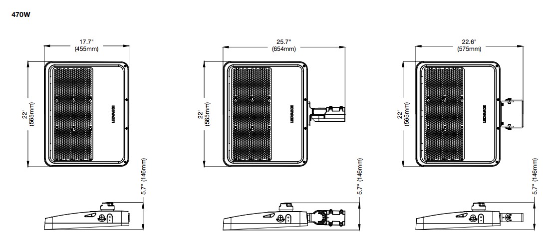 - FLEXMOUNT: ½" IPS knuckle and trunnion (30W and 60W) or Slip fitter and trunnion (140W, 300W and 470W) included in the box