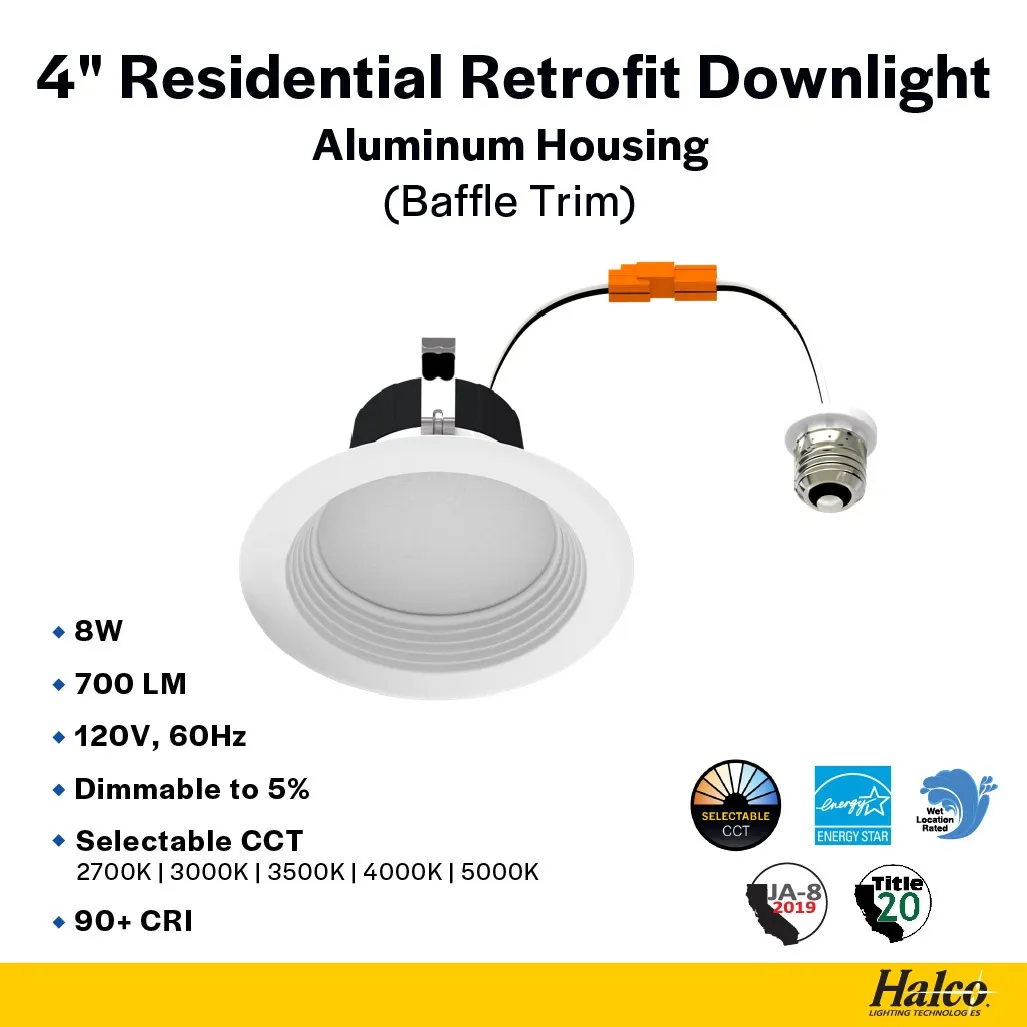 Home Downlights 4" 8W Residential Retrofit Downlight, CCT Selectable, Baffle Trim by Halco
