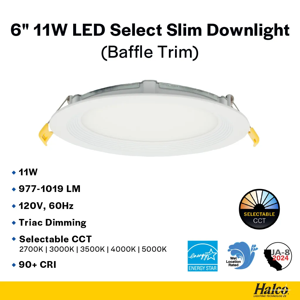 6" 11W Residential Direct Fit Slim Downlight Selectable, Baffle Trim by Halco